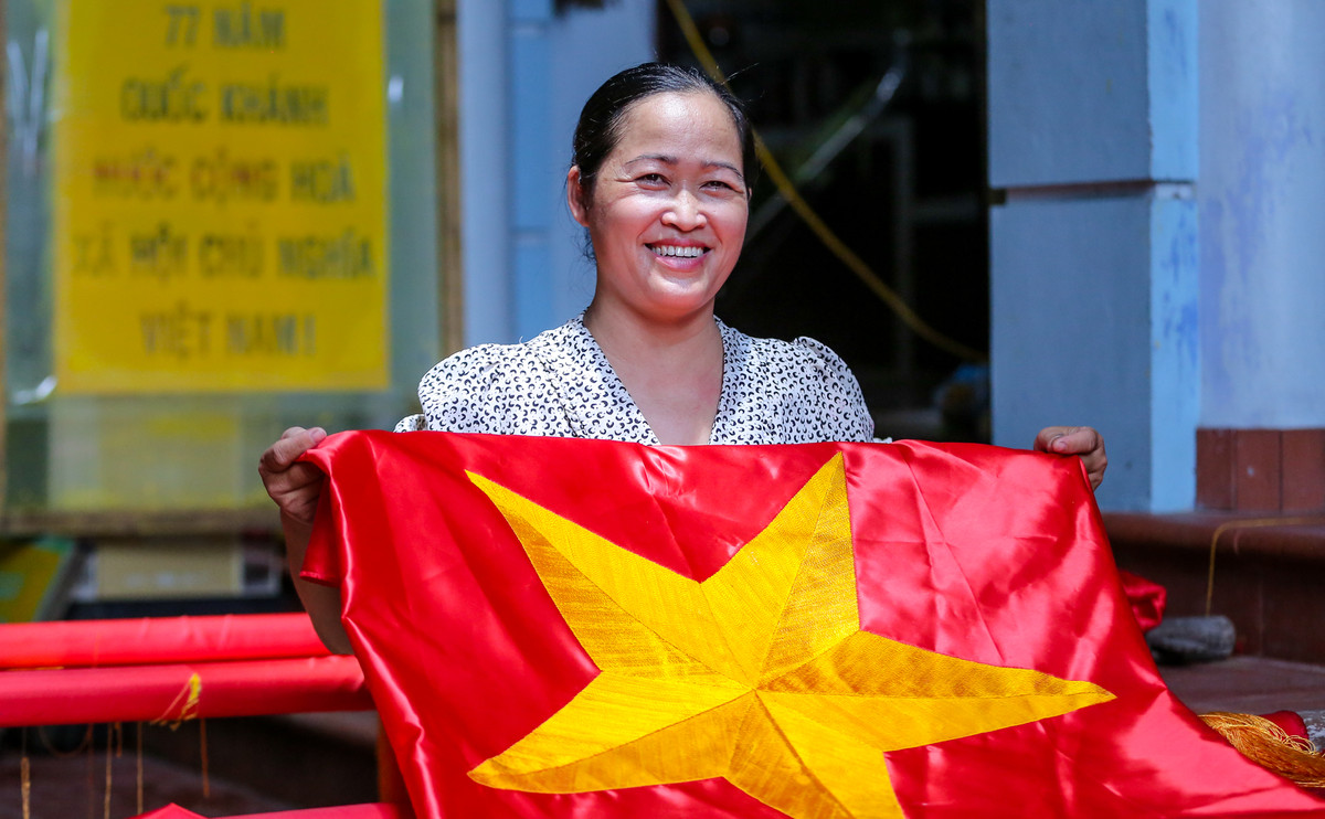 Bà Nhung vui mừng vì sản lượng làm cờ Tổ quốc năm nay tăng gấp 3 - 4 lần so với năm ngoái.