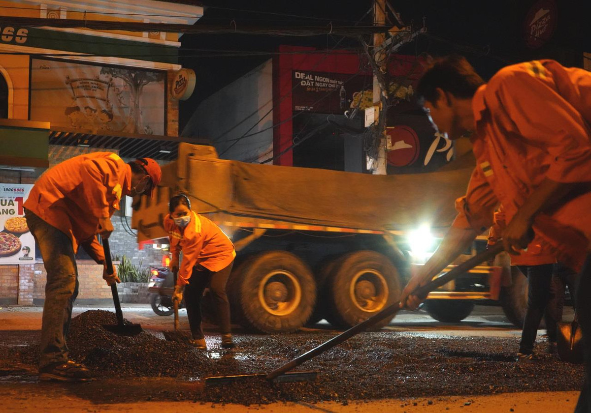 Các công nhân làm việc không ngơi tay để hoàn thành việc thảm lại mặt đường theo đúng kế hoạch.