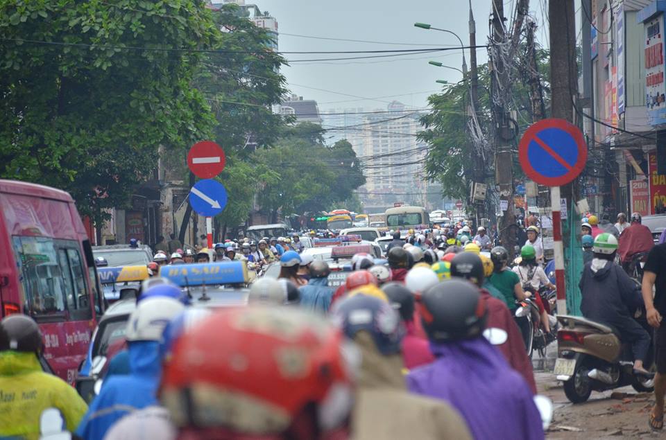 Khoảng 9h mưa ngớt, người dân đổ ra đường đi làm khiến giao thông trên một số tuyến phố ùn tắc kéo dài. (Ảnh: Ngọc Thắng)