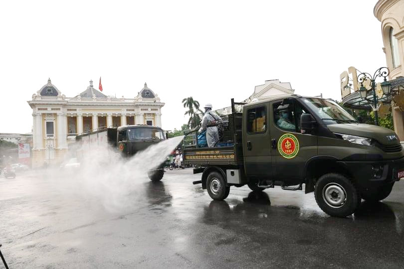 Sáng 26/7, Binh chủng Hóa học (Bộ Quốc phòng) và Bộ Tư lệnh Thủ đô tổ chức phun khử khuẩn diện rộng tại nhiều quận, huyện Hà Nội.