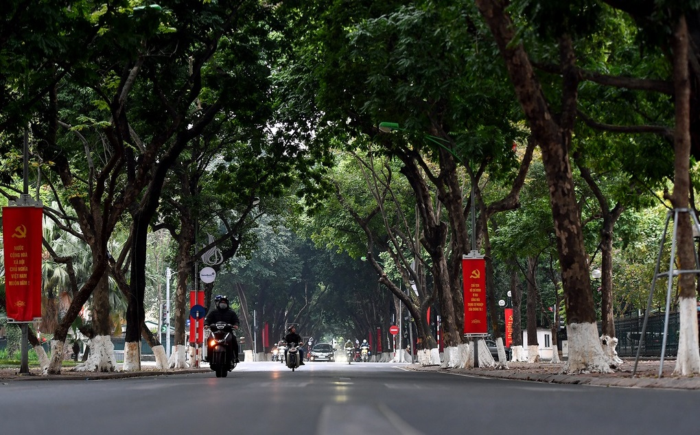 Trên khắp các góc phố, giới chơi ảnh toả đi sáng tác cảnh phố vắng với cờ đỏ sao vàng độc đáo thường xuất hiện chỉ vài tiếng sáng ngày đầu năm mới.