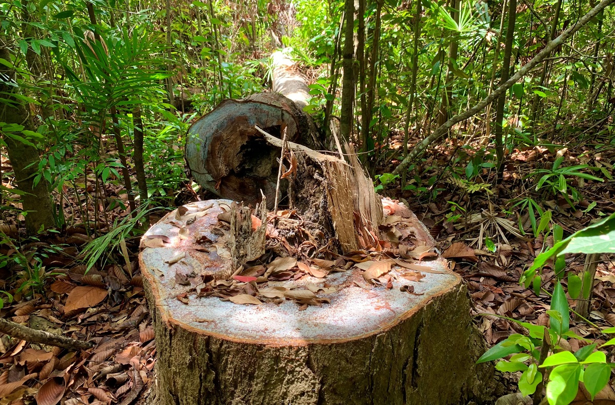 Vị trí mở đường, khai thác gỗ trái pháp luật là khu vực giáp ranh với rừng trồng sản xuất, chủ rừng khai thác gỗ keo nên đối tượng đã dễ dàng mở đường vào rừng phòng hộ chặt hạ cây dầu rái.