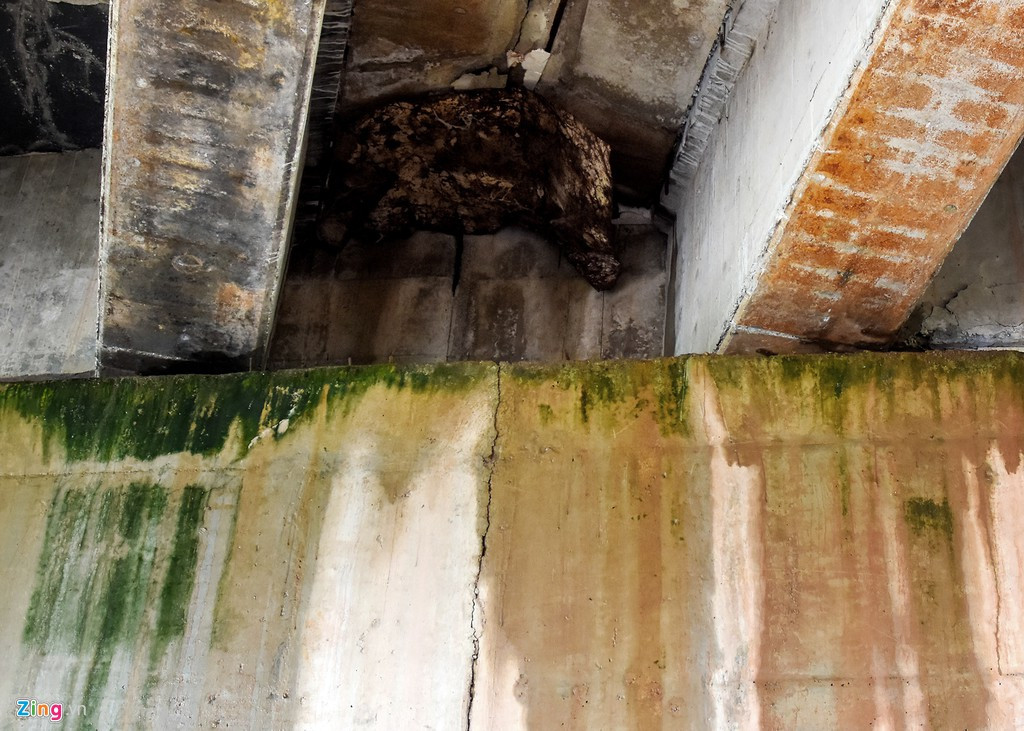 Nước thấm dột tạo mảng rêu xanh lớn bên thành cầu vượt quốc lộ 24B - VD 10A. "Năm ngoái, một số công nhân từng đến xử lý thấm dột cho cầu vượt này nhưng họ sửa qua loa rồi đâu lại vào đó", ông Lê Ba (ngụ xã Tịnh Hà) cho biết.