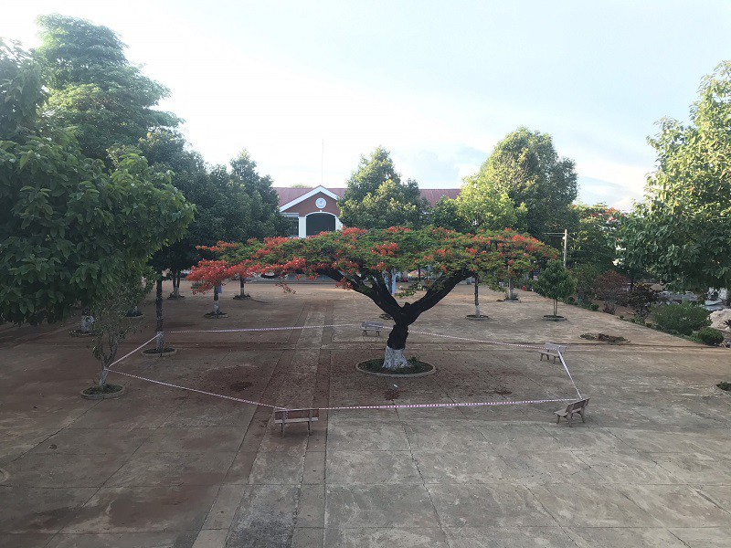 Trường THCS Trần Phú (Đắk Lắk) quây dây cách ly quanh cây phương để tránh học sinh tới gần. Bức ảnh sau khi chia sẻ thu hút gần 90.000 lượt cảm xúc; 4.000 bình luận và hàng nghìn lượt chia sẻ. Đại diện trường không thông tin về việc có chặt hạ cây hay không, nhưng cho biết việc này để đảm bảo an toàn cho học sinh và giáo viên. (Ảnh: Báo Gia Lai).