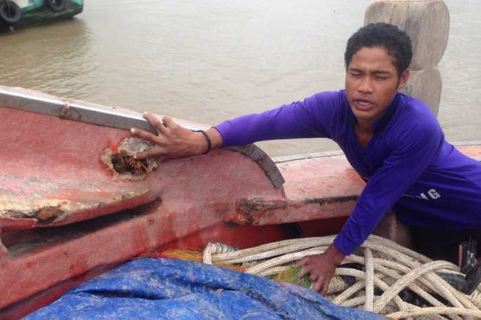 Mạn tàu cá của anh Tửng ghim vết đạn. 'Khoảng một giờ sau, khi hay tin có người trúng đạn chết, chúng đã thả tôi cùng 18 thuyền viên lái tàu về', tài công này cho biết.