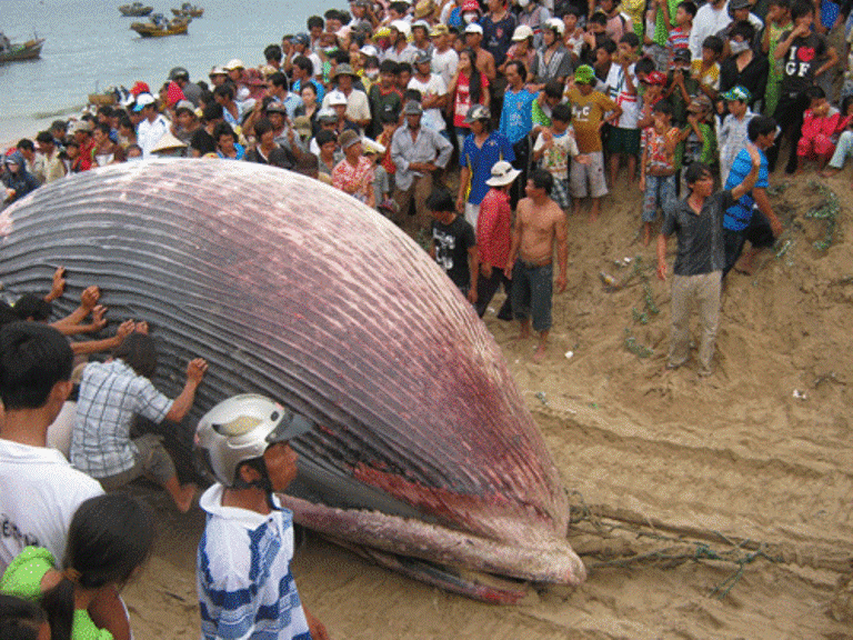 Ngày 16/9, xác con cá voi dài trên 12 m, nặng trên 7 tấn trôi dạt vào gần cửa biển thuộc khu phố 13, thị trấn Liên Hương (Tuy Phong- Bình Thuận).