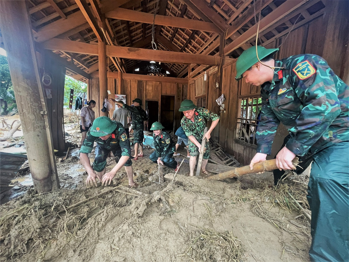 Sáng 3/10, tại thị trấn Mường Xén và xã Tà Cạ (Nghệ An), hàng nghìn chiến sĩ công an, quân đội, cán bộ địa phương, dân quân tự vệ cùng nhau đào xới bùn đất, dựng lại nhà cửa, tìm kiếm tài sản sau khi bị lũ chôn lấp.