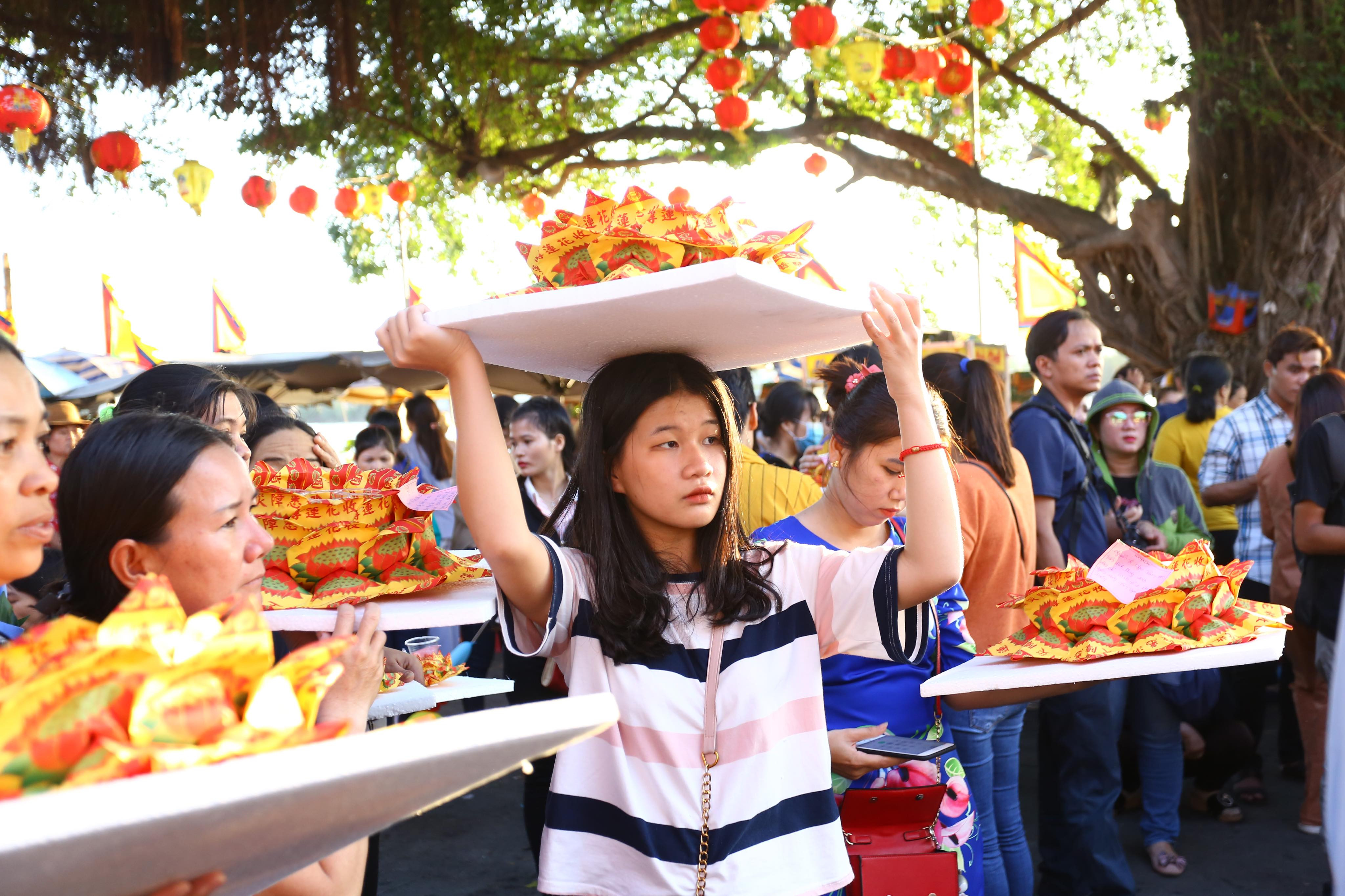 Đội mâm hoa đăng chờ tới lượt khấn nguyện.