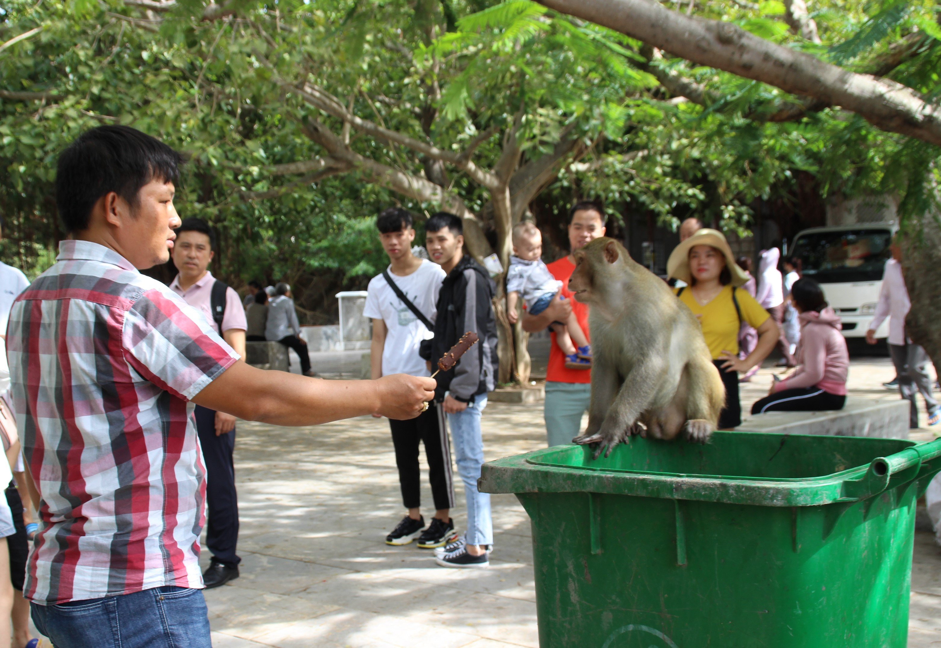 Khỉ ngồi chực thức ăn ở khắp nơi, từ ghế đá, trên cây cho đến thùng rác. Khi đói, đàn khỉ có thể liều lĩnh tấn công, cào cắn, rượt đuổi du khách để “giật” thức ăn.