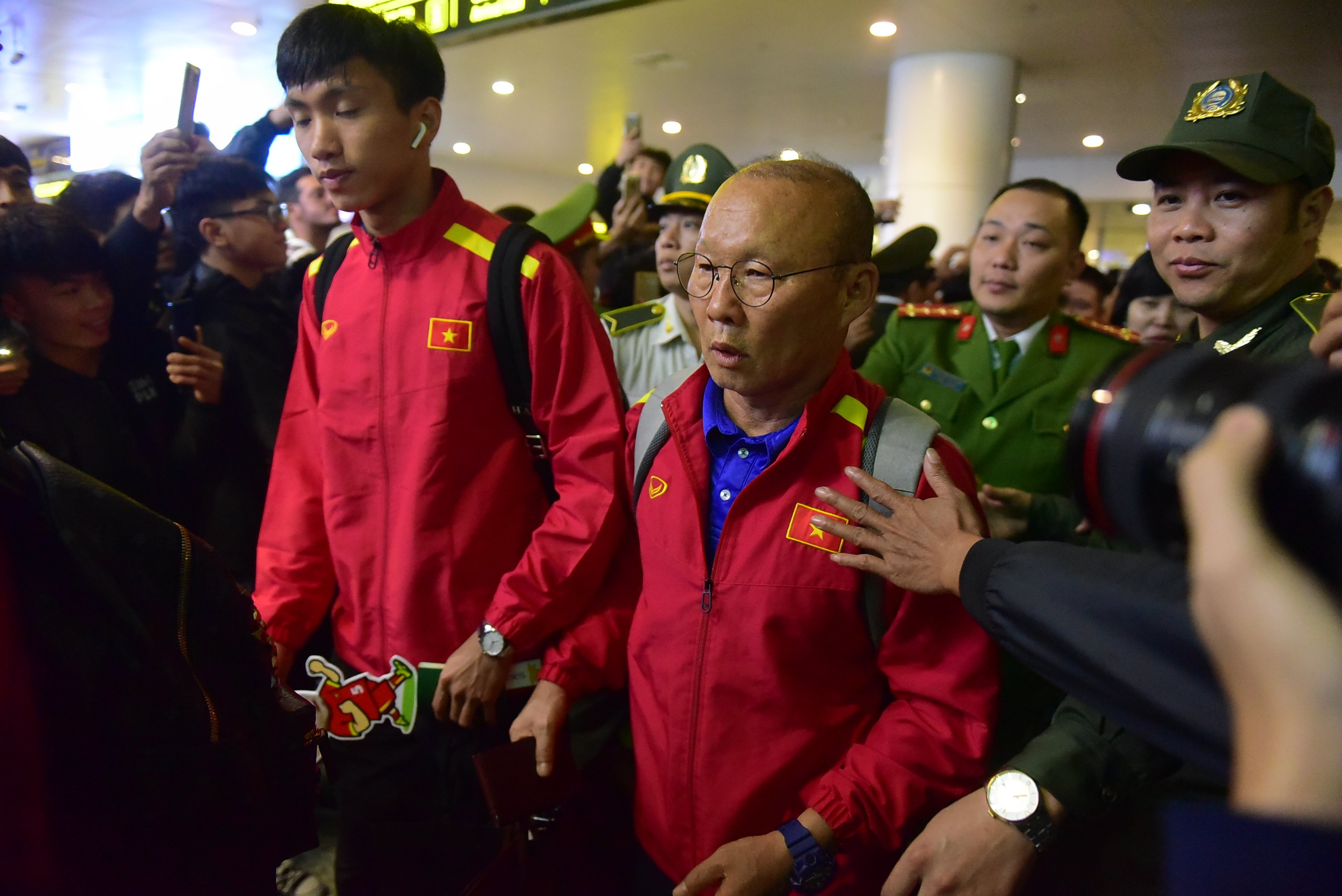 Theo ước tính có gần 500 CĐV đã có mặt tại sân bay Nội Bài chào đón ĐT Việt Nam. Để lên được xe, các cầu thủ Việt Nam gặp không ít khó khăn khi xung quanh là rất đông người hâm mộ.