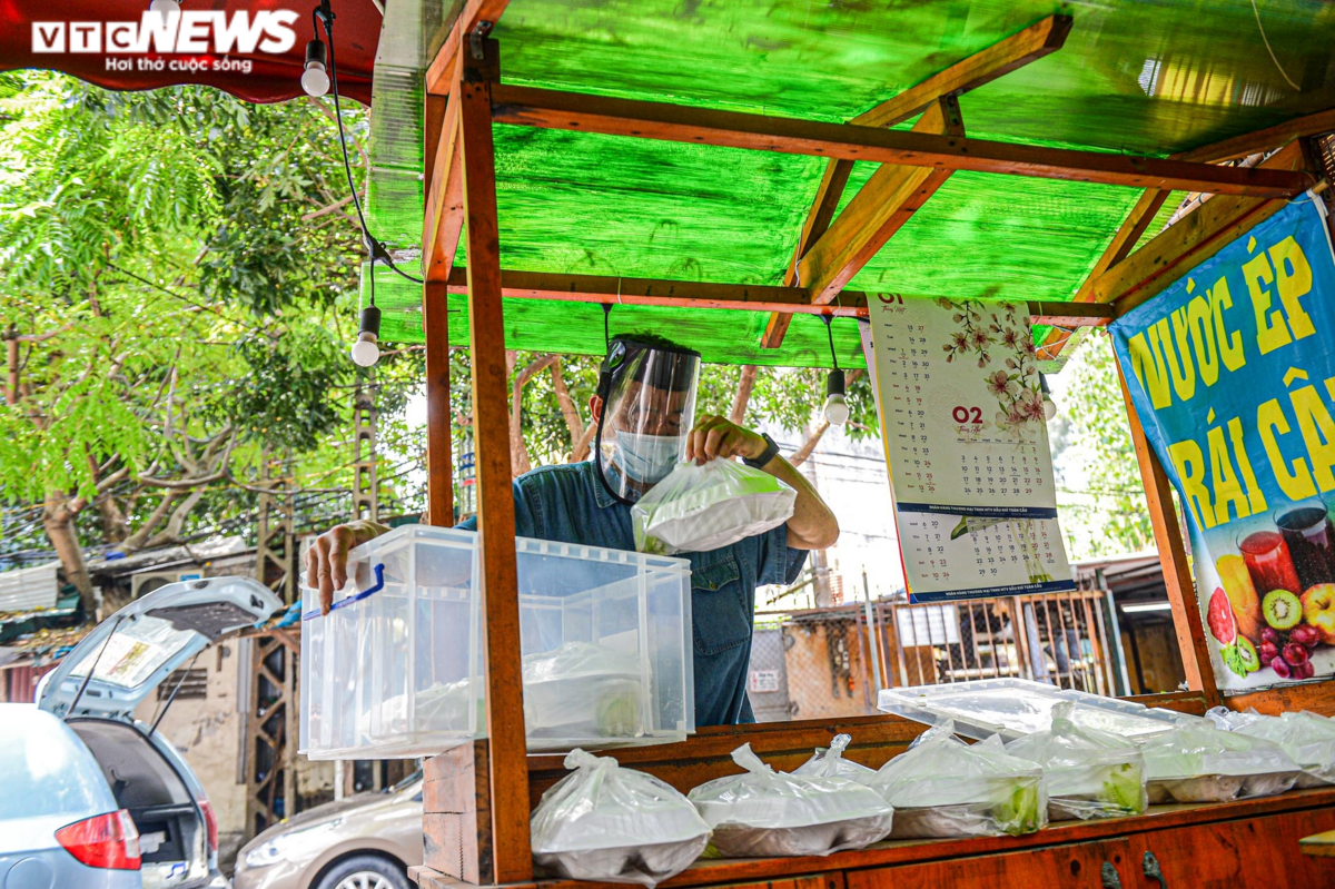 "Do dịch bệnh đang diễn biến hết sức phức tạp, nên tôi sẽ đặt cơm tại bàn này và người dân sẽ tự đến lấy", ông Tuân vừa nói vừa khẩn trương đặt những suất cơm lên bàn tại điểm phát cơm miễn phí ở ngõ 82 Nghĩa Tân.