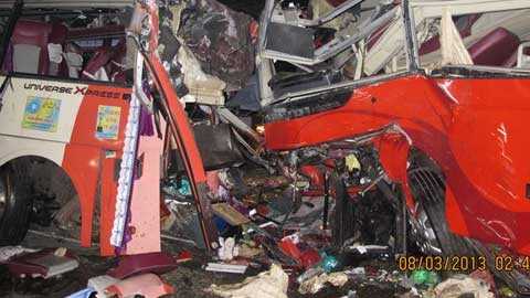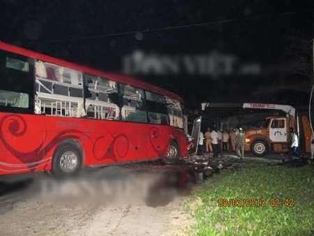 | Hai đầu xe khách nát bươm sau cú tông kinh hoàng. Ảnh: Dân Việt |