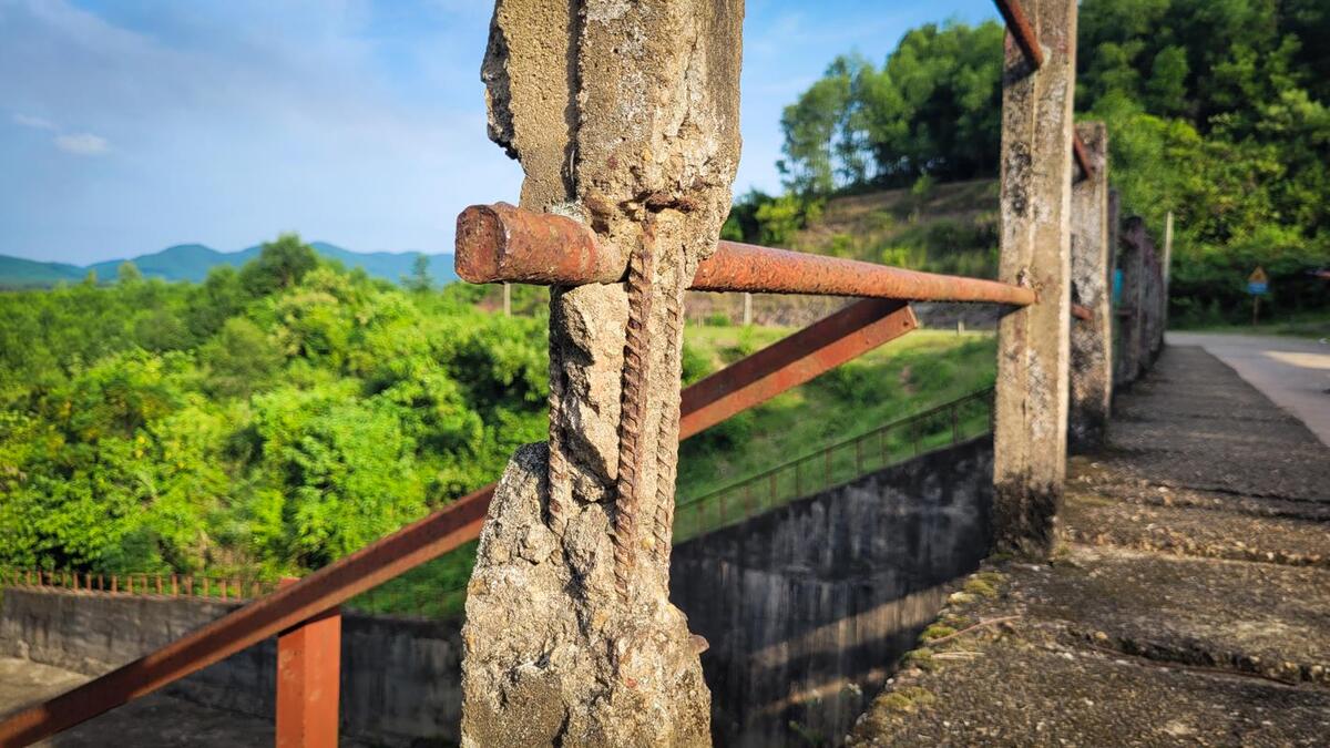 Khu vực cống xả tràn Dốc Miếu xuất hiện nhiều vết nứt nẻ, các cột bê tông bị bong tróc.