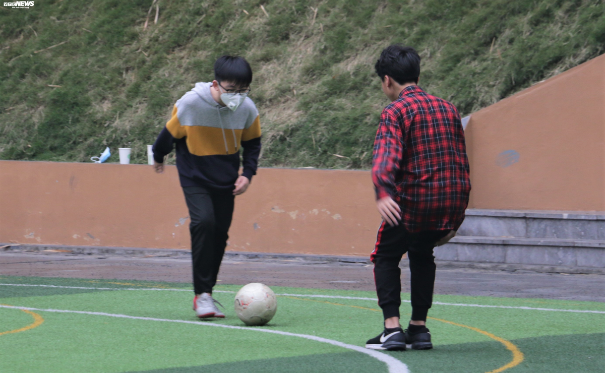 Một số học sinh vừa đeo khẩu trang vừa đá bóng cho biết, khi hoạt động nhiều cảm thấy khó thở và nóng nhưng không đeo lại không được.