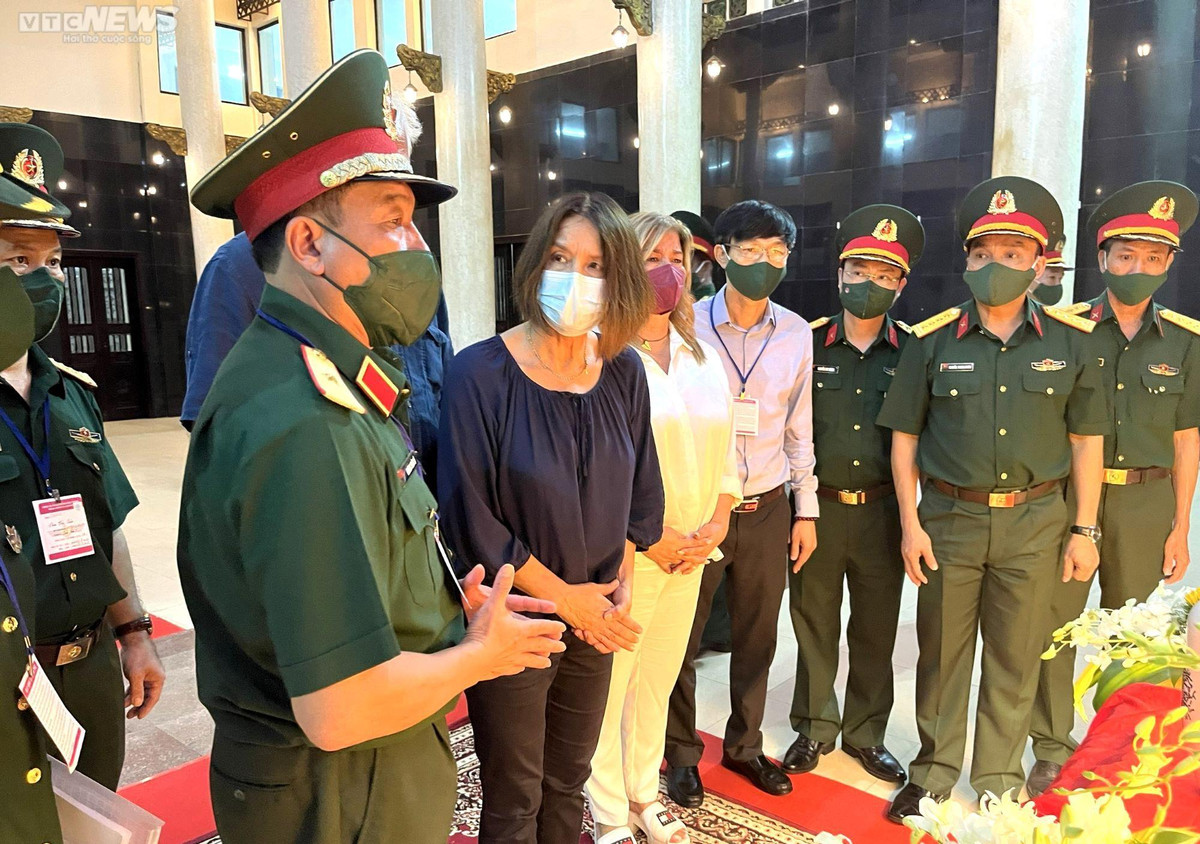 Thiếu tướng Trương Thiên Tô, Phó Chính ủy Quân khu 5 chia sẻ nỗi đau, sự mất mát với bà Foteini Sarantidou (con gái ông Nguyễn Văn Lập) tại lễ truy điệu.