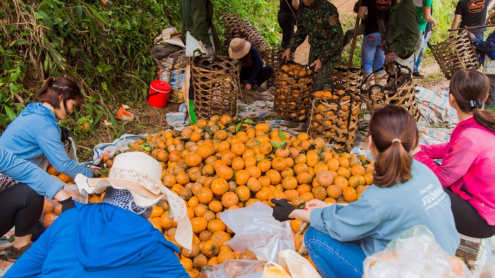 Để giúp bà con trồng cam tại Hàm Yên - Tuyên Quang tiêu thụ nông sản đặc biệt này do dịch bệnh COVID-19, ban lãnh đạo các công ty đã đến tận vườn cam tại Hàm Yên để cắt và đóng gói, vận chuyển về Hà Nội trao tặng tới tay người dân. Mỗi người dân được nhận miễn phí 1 túi cam 5kg khi đến các địa điểm trên.