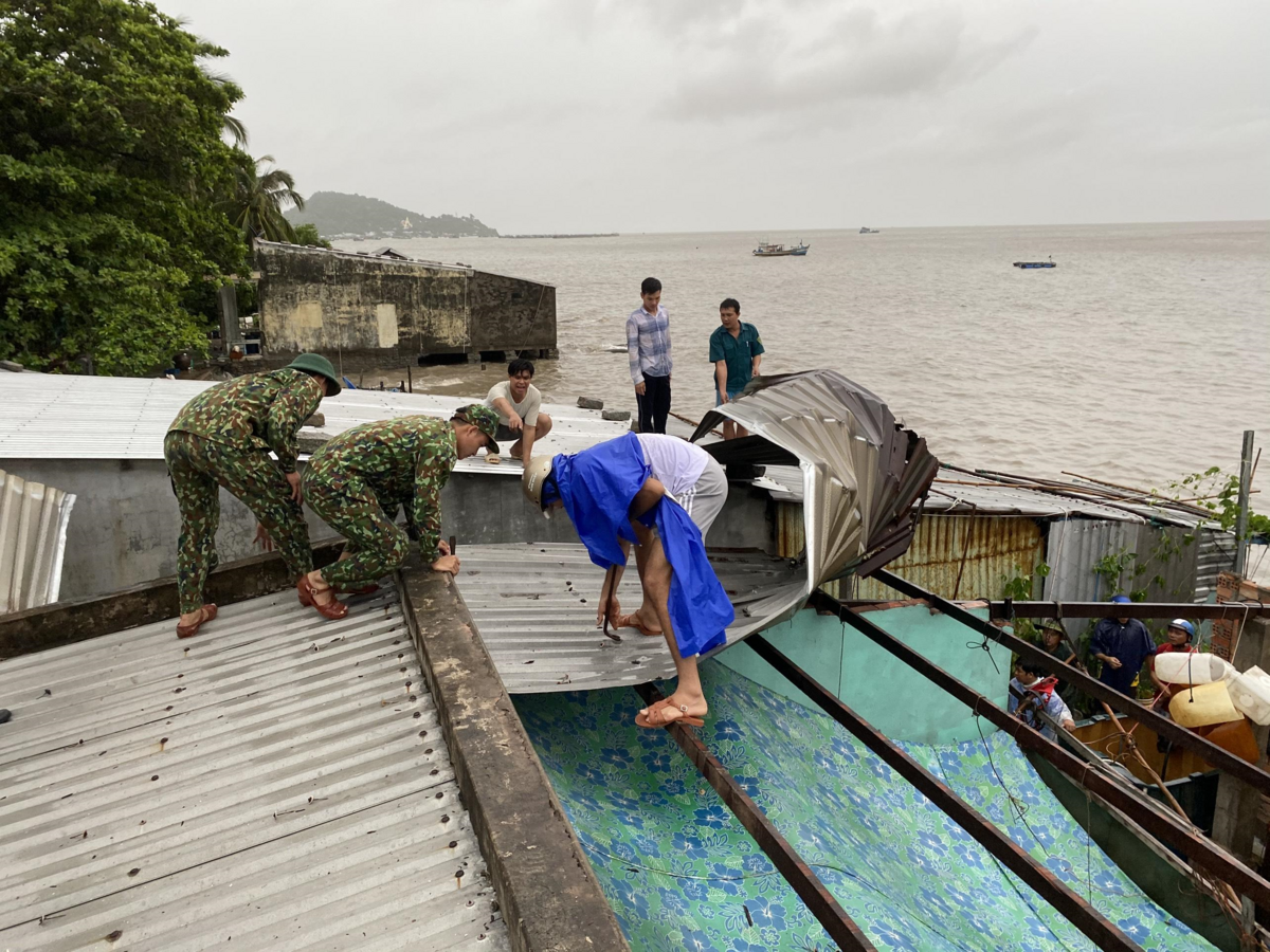 Ban chỉ huy Phòng chống thiên tai và tìm kiếm cứu nạn huyện đảo Kiên Hải cử lực lượng giúp người dân khắc phục thiên tai. (Ảnh: Phương Vũ)