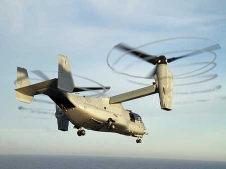 | V-22 có khả năng tự động xoay cánh quạt và dùng lực nâng của 2 cánh chính để hạ cánh an toàn như máy bay phản lực thông thường trong khi các trực thăng khác vẫn phải quay cánh quạt với công suất thấp trong lúc hạ cánh |