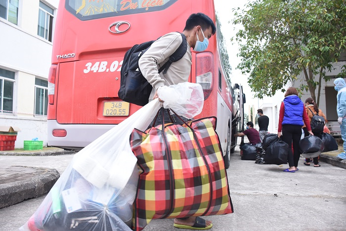 Chiều 16/2, những chuyến xe chở công nhân công ty POYUN (thuộc khu công nghiệp Cộng Hòa, phường Cộng Hòa, TP Chí Linh, Hải Dương) tại điểm cách ly tập trung trường Trung cấp nghề Việt Nam - Canada tới điểm cách ly mới.