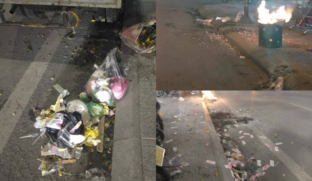 Tại một số tuyến phố chính, những hộ dân sinh sống hoặc kinh doanh ở mặt đường, sau khi cúng ngoài trời xong, nhiều người hoá luôn vàng mã, vứt hoa cúng và rải cháo, gạo, muối và những hạt nổ đủ màu sắc ra đường. Hành động này khiến nhiều tuyến phố ngập ngụa trong rác và làm xấu đi hình ảnh thành phố du lịch trong mắt du khách.