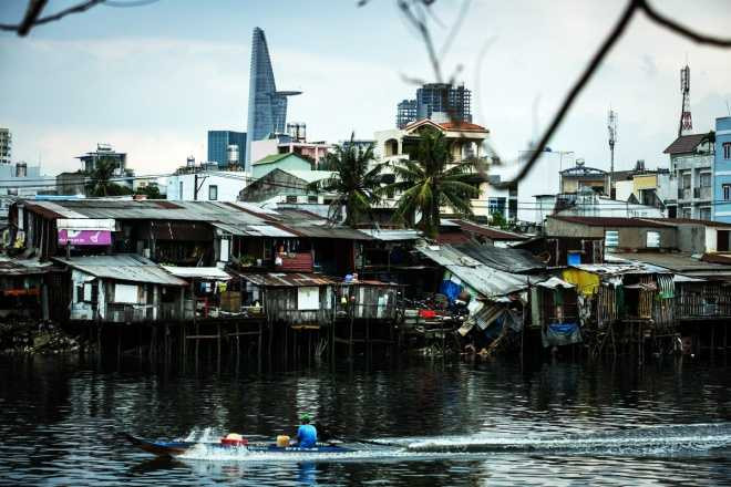 Cảnh đối lập giữa khu nhà ổ chuột ở quận 4, 8 với những dãy chung cư cao tầng. Theo kế hoạch, từ nay đến năm 2020, chính quyền thành phố sẽ di dời và tổ chức lại cuộc sống cho hơn 20.000 căn nhà ven kênh rạch nhằm chỉnh trang và phát triển đô thị.