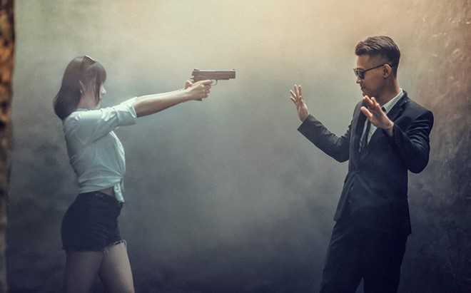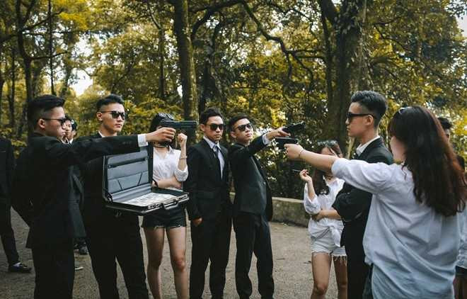 Các thành viên lớp 12A1 trở thành diễn viên thực thụ khi khoác lên mình bộ vest, kính đen và sử dụng súng giả làm đạo cụ.