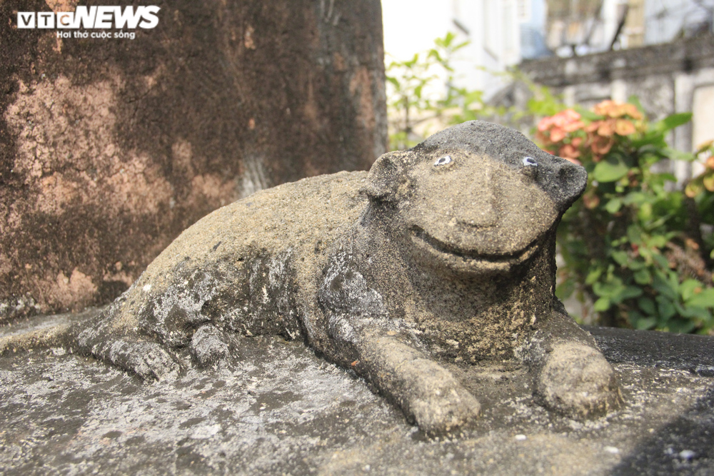 Một trong hai con nghê có mắt lồi, đuôi xòe, nhe răng đứng nhìn về phần mộ, ngay cửa vào khu mộ.