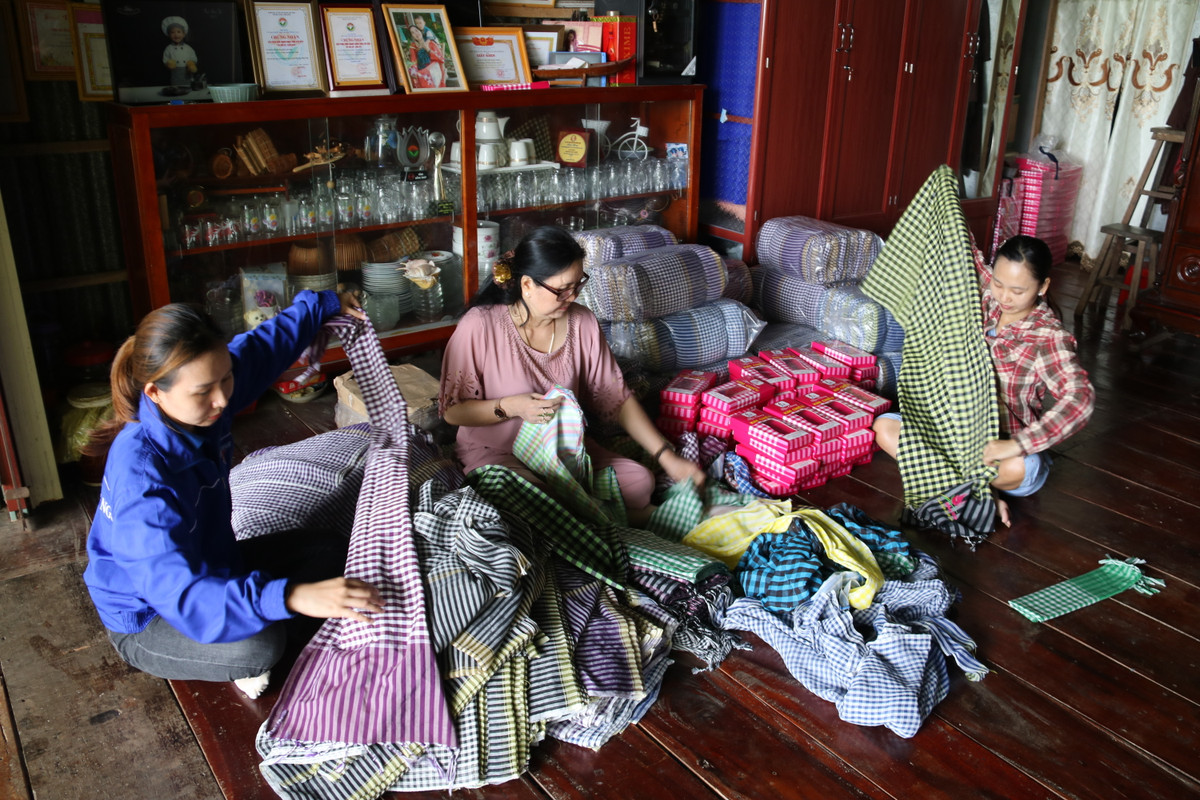“Các sản phẩm làm quà tặng cũng đòi hỏi độ dày dặn, đa dạng mẫu mã, màu sắc bắt mắt. Từ 3 màu ca-rô truyền thống, hiện làng nghề làm ra gần trăm mẫu mã khác nhau kết hợp thêu logo, biểu tượng sếu, hoa hồng...”, bà Chiều thông tin.