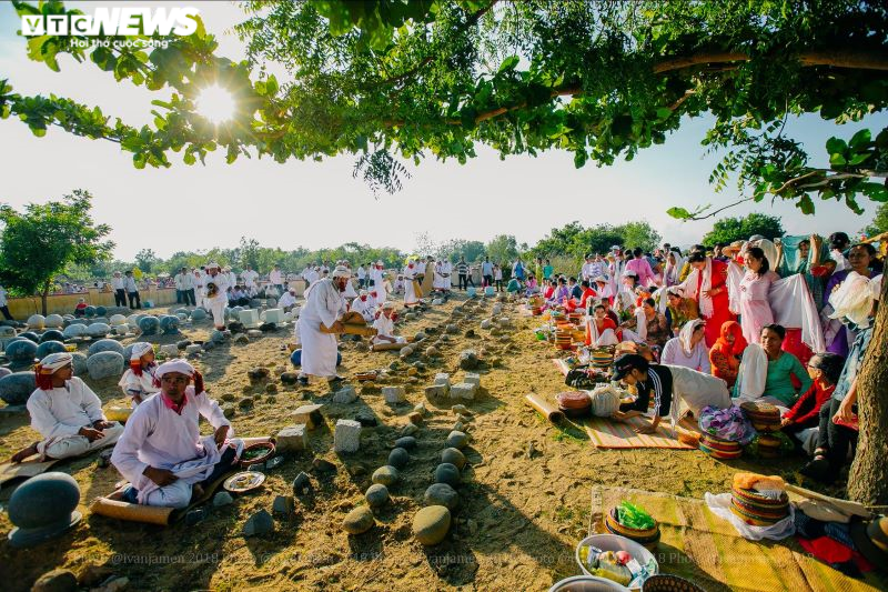 Từng tộc họ đến nghĩa địa để làm cỏ, vun đất phần mộ cho sạch đẹp. Mộ của người Chăm Bàni là những hòn đá tròn xếp thành những hàng dài rất đều đặn. Tất cả được chôn có khoảng cách đều nhau và theo hướng Bắc - Nam. Hướng Bắc là vị trí của đầu, hướng Nam là vị trí của chân. Các mộ liền nhau, thậm chí chôn chồng lên nhau nên còn được coi là mộ chôn chung.