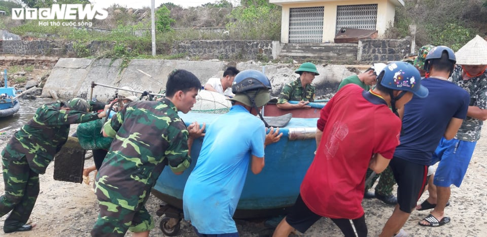 Những chiến sĩ bộ đội biên phòng đang giúp dân đưa tàu thuyền lên bờ.