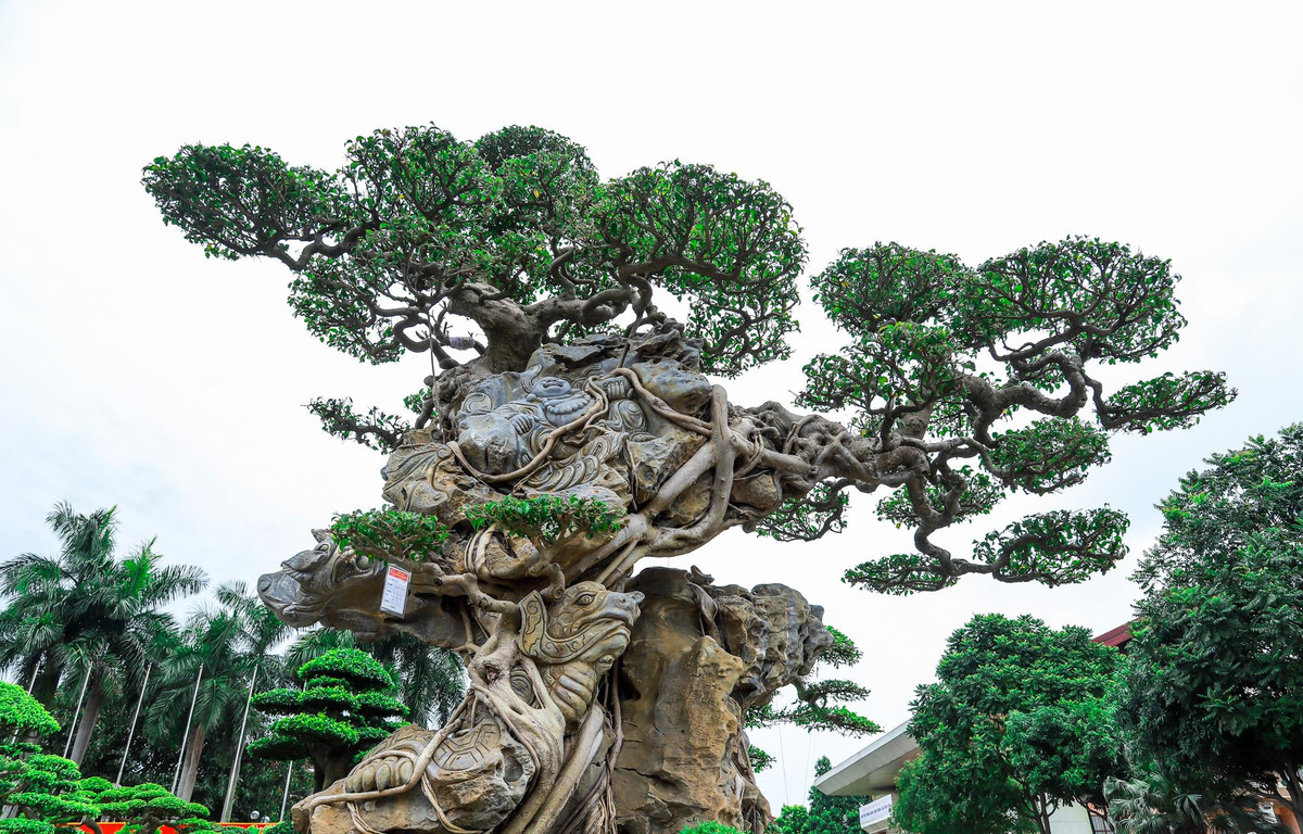 Các tác phẩm trưng bày hội tụ đầy đủ tinh hoa nghệ thuật từ cây cảnh truyền thống đến cây cảnh đương đại, mang đậm tính nhân văn và triết lý sâu sắc. Trong ảnh là tác phẩm sanh cổ “Thành đồng tổ quốc” của nghệ nhân Dương Văn Mười. Cây cao hơn 2m, tán rộng hơn 3m. Hiện tại đã có người trả giá tác phẩm này hàng chục tỷ đồng nhưng ông mười không bán. Tuy cây được cắt giật nhưng nhìn tự nhiên như một cây cổ thụ thu nhỏ. Theo ông Mười, sở dĩ tác phẩm có tên “Thành đồng tổ quốc” bởi nhìn cây vững chãi như một bức tường thành.