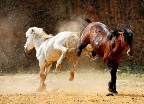 Sân đấu được qui định trong vạch tròn .Một chú ngựa cái đẹp được đưa vào để hai đấu sĩ ngựa tranh nhau ,chú ngựa nào bị đẩy ra ngoài vạch vôi hai lần sẽ bị xử thua |
