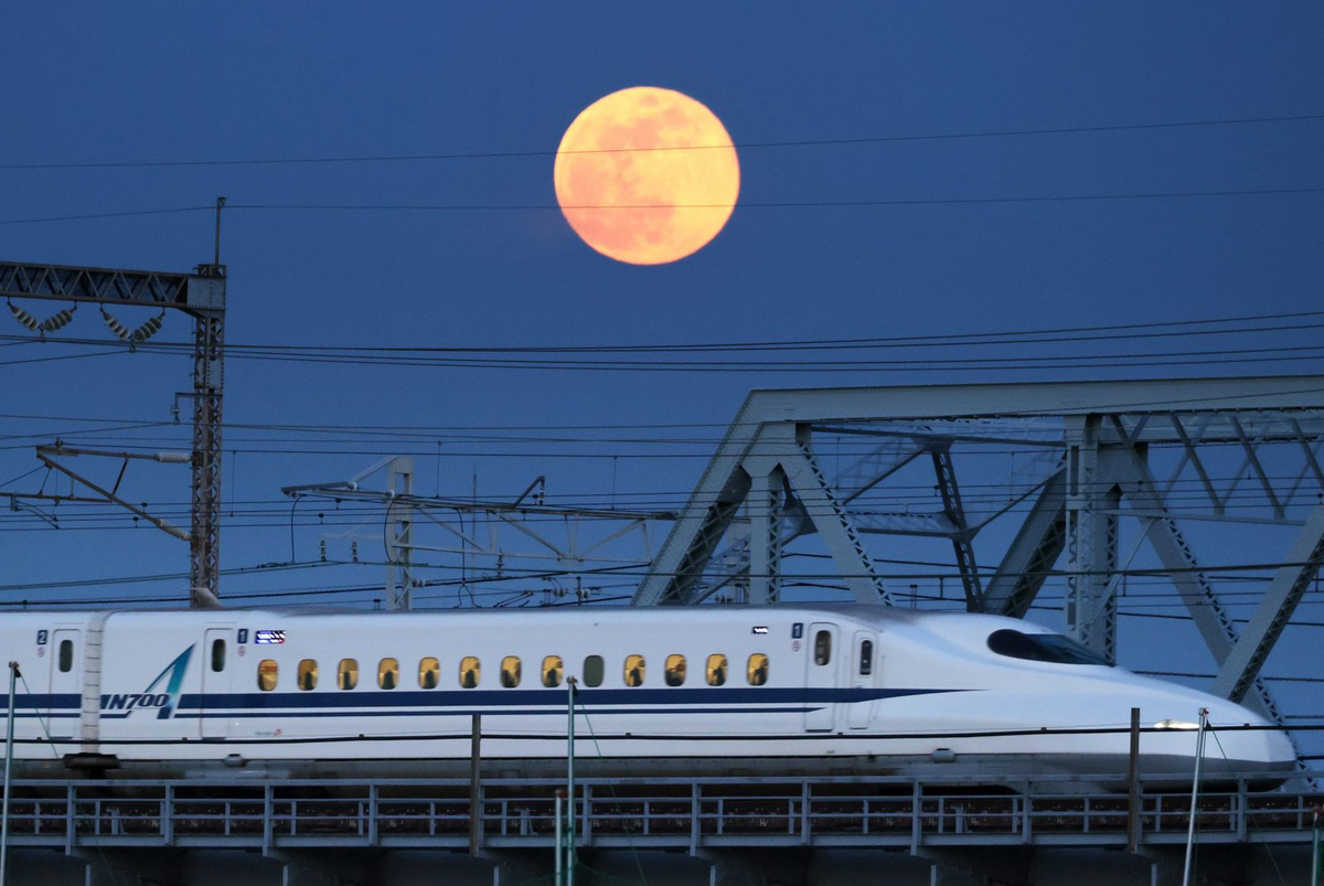 Mặt trăng xuất hiện phía trên một tàu cao tốc ở Tokyo vào ngày 7/5. (Ảnh: Yoshio Tsunoda/AFLO/Reuters)