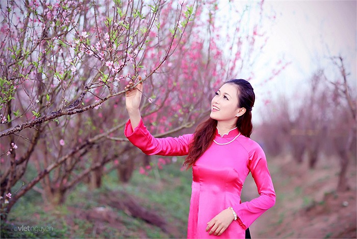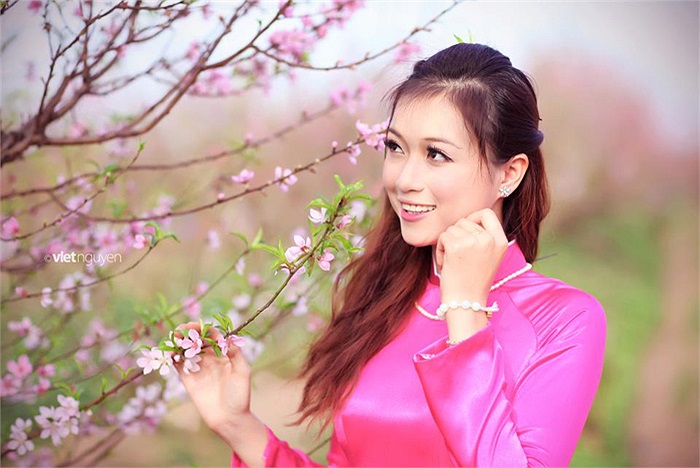 Sắc thắm của hoa đào đầu xuân càng khiến cho nữ sinh xinh đẹp này thêm rạng rỡ