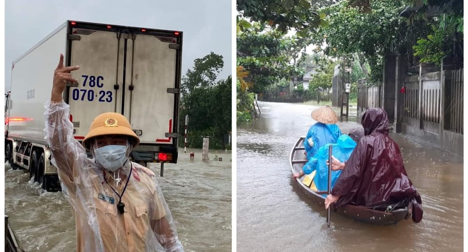 CSGT Công an tỉnh Thừa Thiên - Huế đội mưa, lội nước để điều tiết giao thông tại tuyến đường trên quốc lộ 1A đang bị ngập.