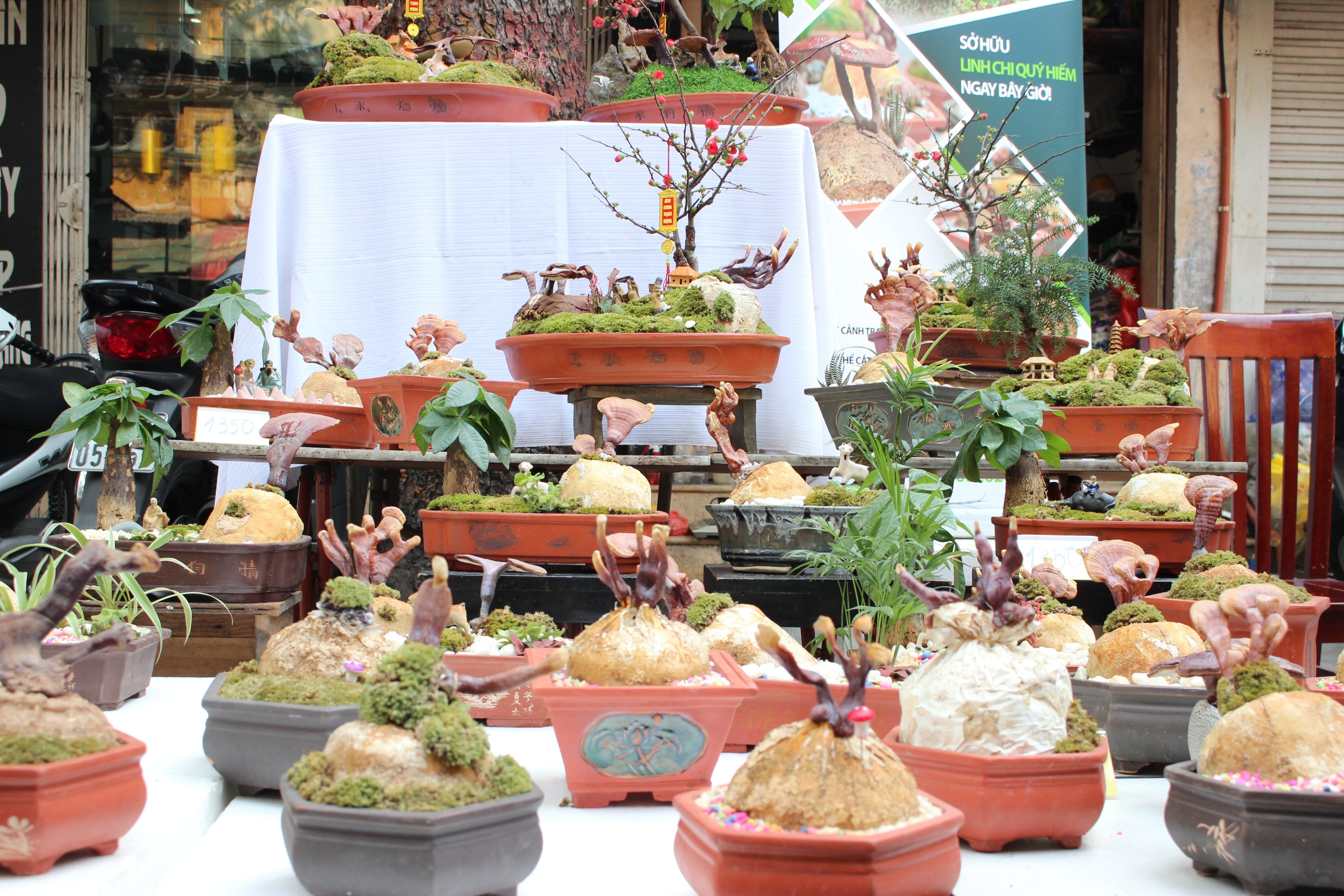 Rất nhiều người đi qua khu vực chợ hoa cổ Hàng Lược, quận Hoàn Kiếm, hà Nội không khỏi ngạc nhiên trước một gian hàng bày bán các loại nấm linh chi bonsai phục vụ thú chơi Tết độc đáo.