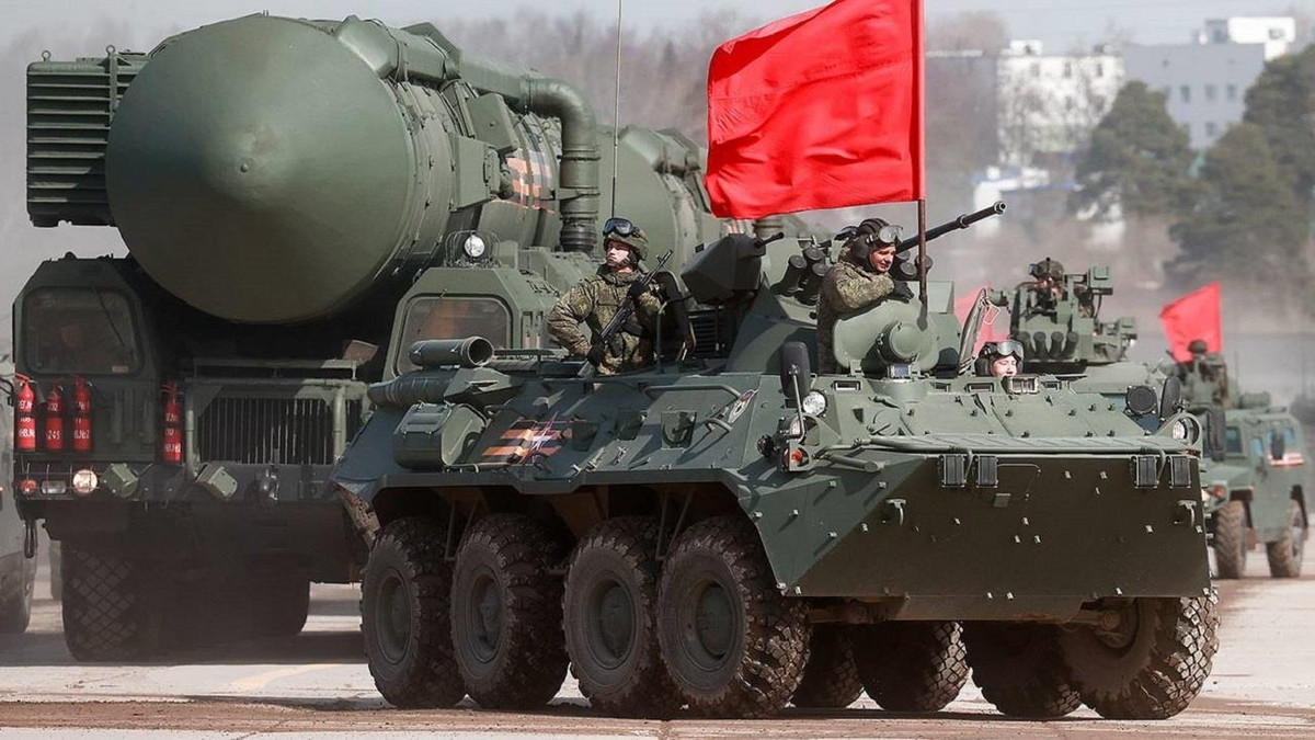 Xe thiết giáp chở quân BTR-82A dẫn đội hình hệ thống tên lửa đạn đạo xuyên lục địa (ICBM) RS-24 Yars. (Ảnh: TASS)