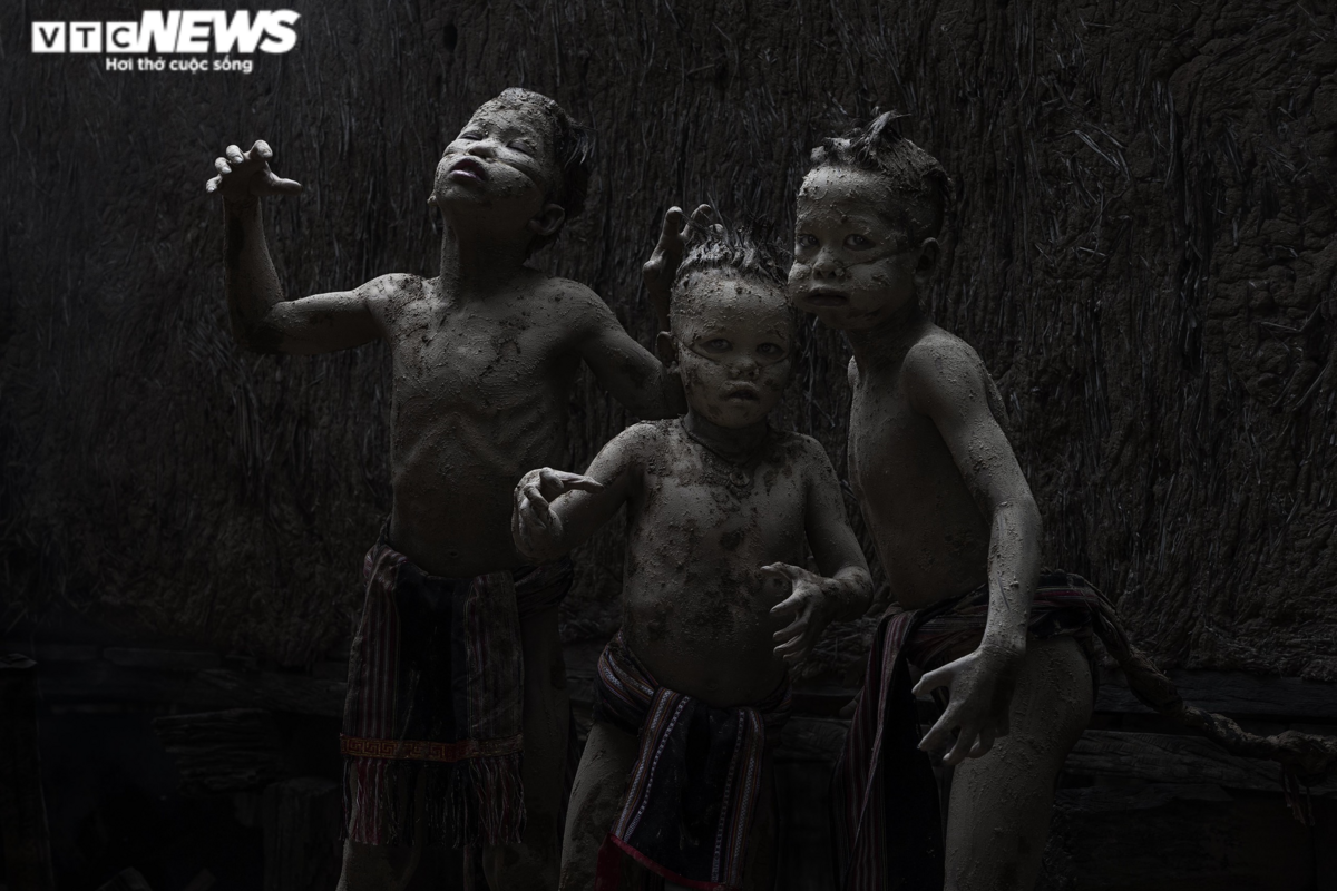 Anh Khang, người thường đắp Ma Bùn cho hay: "Để hóa trang giống các hồn ma, anh phải đi lựa những màu bùn thật đẹp, rồi trộn chúng lại với nhau, sau đó bôi lên người. Hóa trang thành Ma Bùn cho trẻ em nhằm gợi lại những lễ hội ngày xưa cha ông hay làm". (Ảnh: Thái Bana)