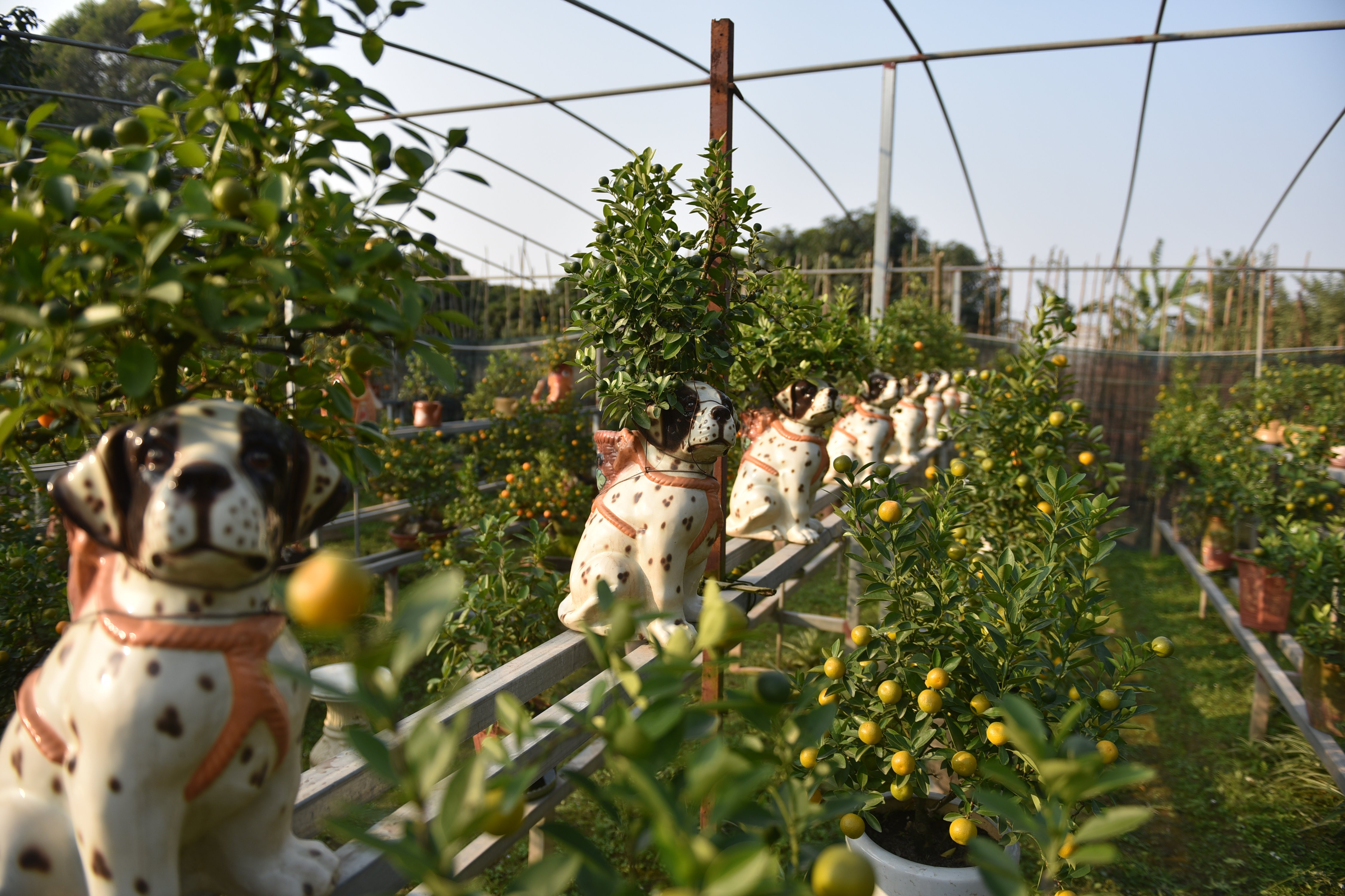 Năm nay, ông Trương Ngọc Xuân - một chủ vườn cây cảnh ở Bắc Từ Liêm (Hà Nội) sáng tạo ra cách làm độc đáo: trồng quất cảnh trong chậu sứ hình chú chó đốm ngộ nghĩnh.