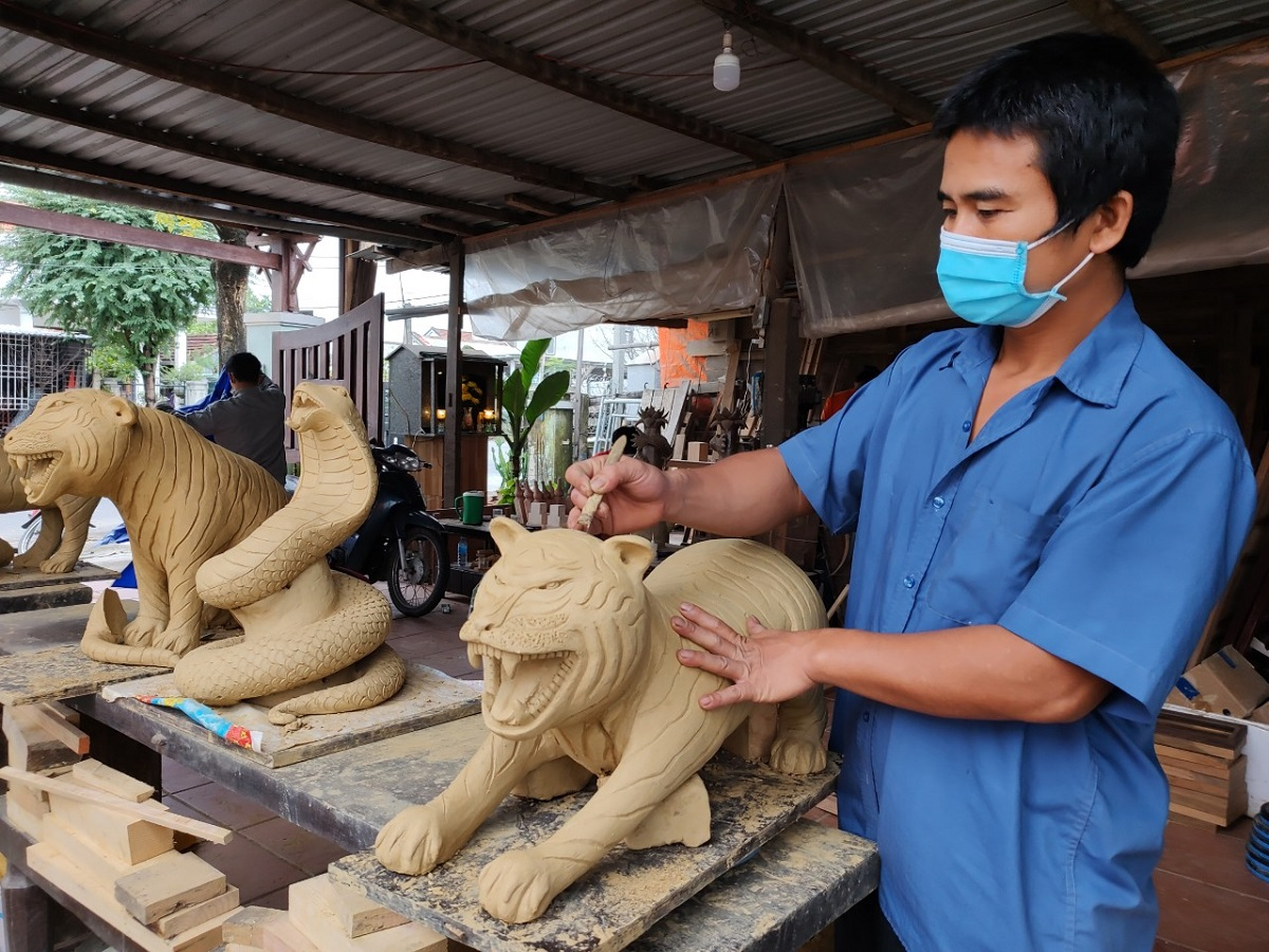 Không do dự, nghệ nhân xếp vào loại có tay nghề cao của làng gốm 500 tuổi gật đầu đồng ý. Ngay lập tức, anh lên mạng tìm hiểu, xem video, ảnh về loài hổ với đủ tư thế đứng, ngồi, vồ... Sau đó, anh bắt tay nhào đất tạo hình thân, gắn thêm chân, đầu thành khối liên kết rồi trang trí hoa văn.