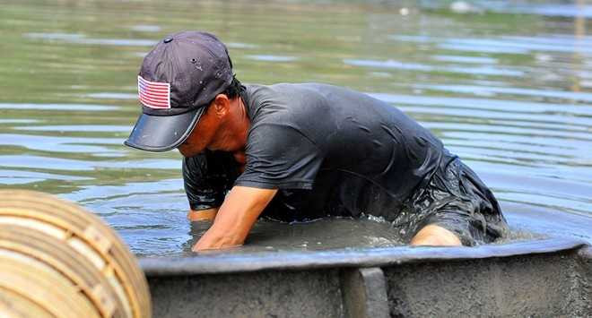 | Nhiều người tự bảo vệ bằng cách đeo găng tay cao su. Vợt dùng để xúc trùn được làm bằng khung sắt to nên có thể ngồi trên thuyền để kéo. "Sạch nhưng hiệu quả không cao. Lượng trùn đãi được chỉ bằng 1/4 so với cách ngâm mình xúc bùn trực tiếp", ngư dân tên Hòa chia sẻ. |