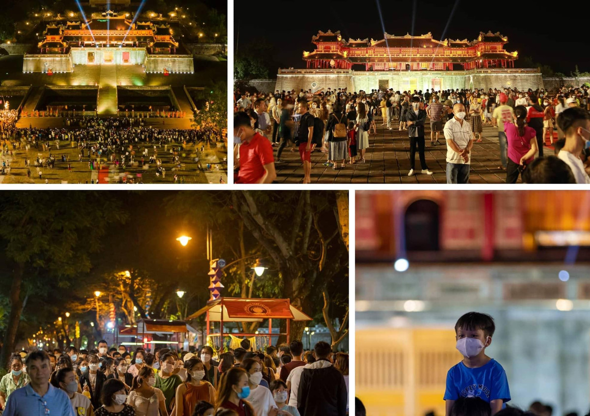 Dòng người chen chúc nhau về khu vực quảng trường Ngọ Môn (Đại Nội Huế) trong ngày khai trương phố đêm Hoàng thành.