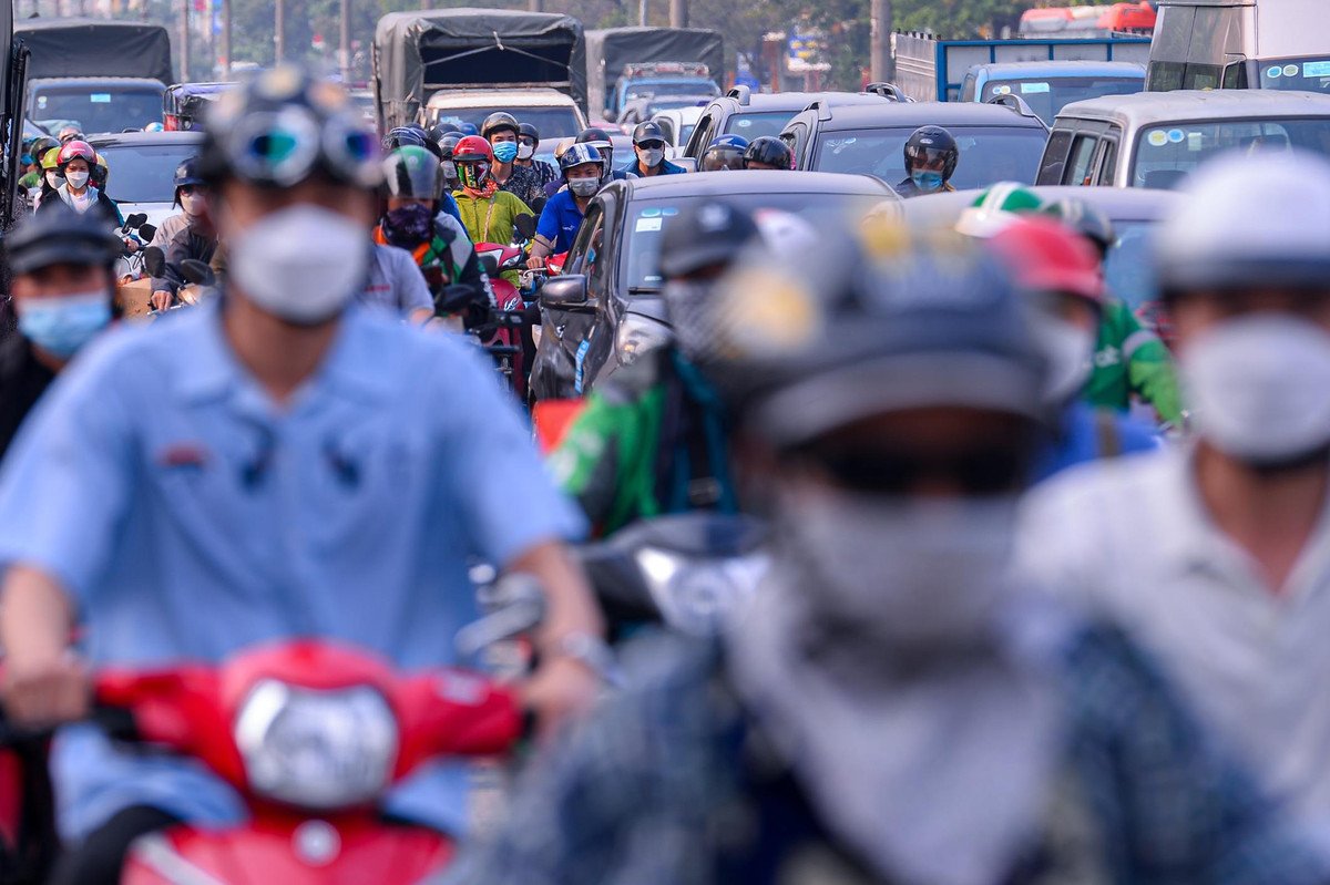 Dòng xe cộ nối đuôi nhau nhích từng chút tại đường vành đai 3.