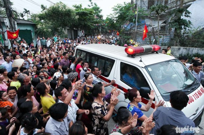Người dân Đồng Tâm reo hò, vỗ tay khi thấy xe chở cụ Lê Đình Kình về đến làng. (Ảnh: Nguyễn Khánh)