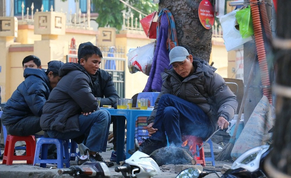 Nhiều người dân ngồi uống trà đá, đốt lửa sưởi ấm trên phố Hà Nội. (Ảnh: Tùng Lâm)