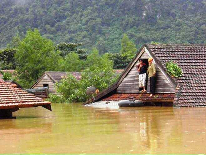 Người dân Quảng Bình phải trèo lên nóc nhà để tránh dòng nước lũ.