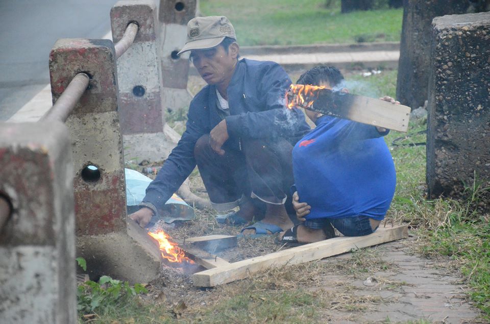 Nhóm xe ôm, người bán hàng ven đường quây quần sưởi ấm quanh đống củi đốt bên đường Trần Hưng Đạo, Hoàn Kiếm.