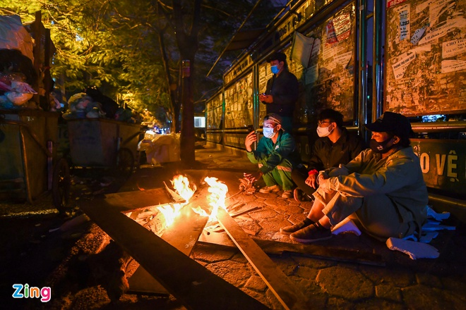 Nhóm công nhân vệ sinh môi trường trên phố Vũ Tông Phan (quận Thanh Xuân, Hà Nội) đốt lửa để xua tan cái lạnh trong lúc đợi xe rác về thu gom.