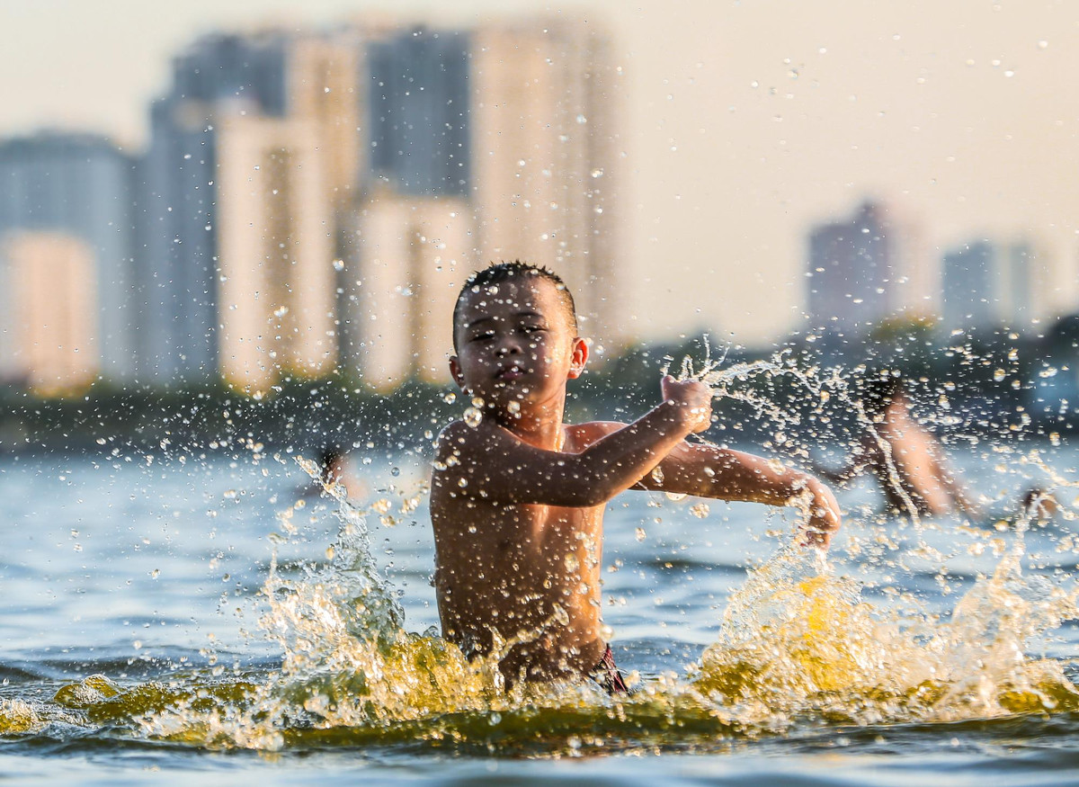 Trời oi bức, nóng nực khiến nhiều người dân Thủ đô tìm đến các bãi tắm tự phát ven hồ Tây bơi “giải nhiệt”.