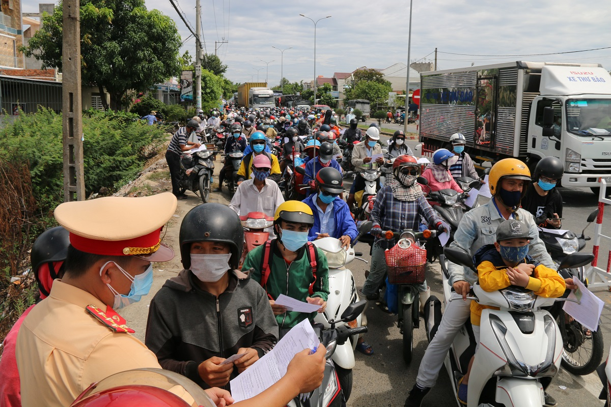 Việc người dân ùn ùn rời Đà Nẵng, di chuyển về Quảng Nam (chủ yếu bằng phương tiện xe máy) đã tạo nên cảnh ùn tắc kéo dài hàng trăm mét ngay tại chốt kiểm soát dịch đặt ở xã Điện Thắng Bắc, thị xã Điện Bàn, Quảng Nam - khu vực giáp ranh với địa bàn TP Đà Nẵng.